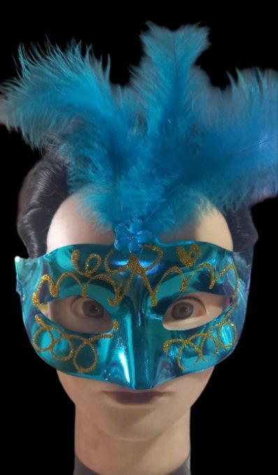Este antifaz cuenta con un acabado metalizado en un encantador tono celeste que refleja la luz con sutileza, añadiendo un toque de glamour a tu look. Los delicados detalles en gibre dorado realzan su diseño, creando un contraste perfectamente equilibrado. Las plumas turquesas, ligeras y vibrantes, coronan este antifaz, aportando un dinamismo visual que lo convierte en una verdadera obra de arte.