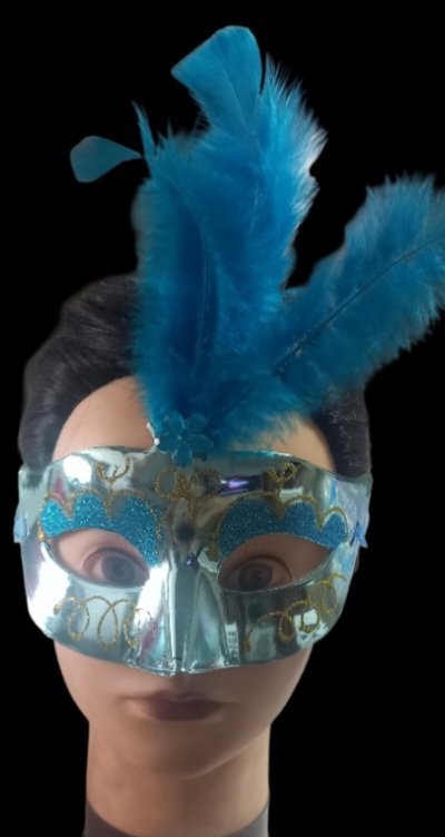 El antifaz veneciano combina la calidad con el diseño excepcional. Su estructura metálica color celeste claro posee un acabado brillante, complementado por destellos de gibre dorado que resaltan su forma elegante. Los detalles en los párpados, decorados con gibre celeste, dan un toque extra de luminosidad, añadiendo profundidad y definición al diseño. Finalmente, el antifaz se adorna con plumas en un tono celeste azulado, cuidadosamente seleccionadas para crear un acabado vibrante y sofisticado.