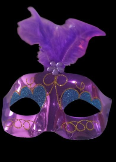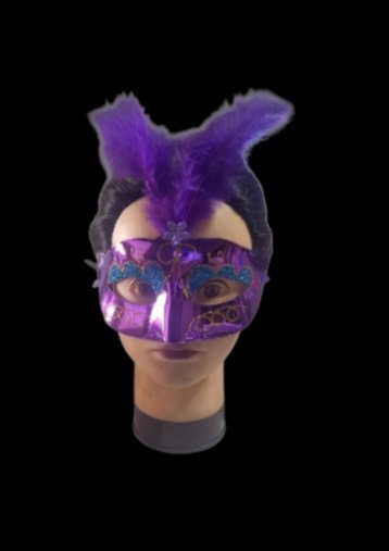Fabricado con materiales livianos y cómodos, el antifaz está diseñado para mantenerse fijo y seguirte el ritmo durante toda la celebración. La mezcla de brillo glitter y las plumas violetas no solo aportan color y textura, sino también un aire de lujo y exclusividad que encantarán a todos los presentes.